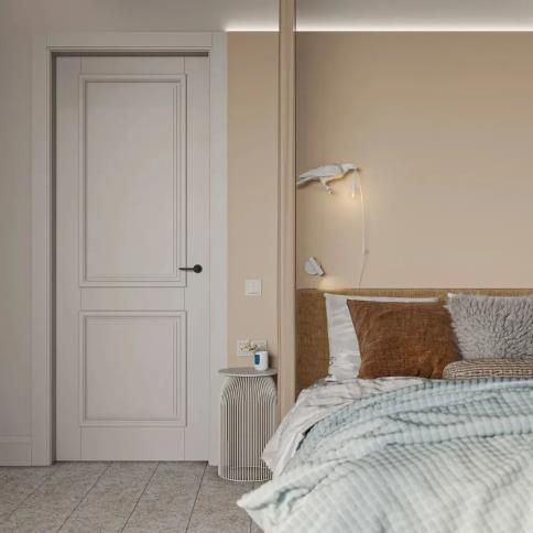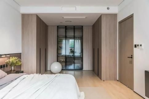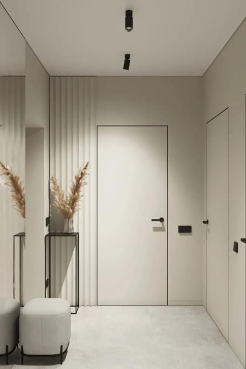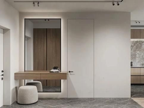 從色彩和風(fēng)格起程進(jìn)行匹配,選取和墻面相近的色彩并且沒(méi)有裝潢的平坦門(mén)套,門(mén)套隱形于墻體之中,融為一體,能夠起到衍生空間的功效。