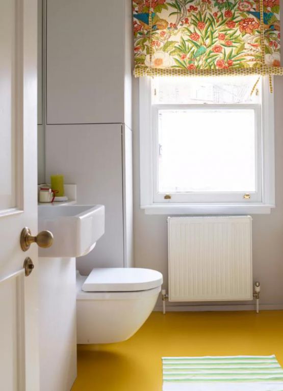 誰說拼色只是為了時尚?在這個小衣帽間里也很有效。簡潔是關鍵,引人注目的黃色地板從白色背景和浴室套房中突顯出來