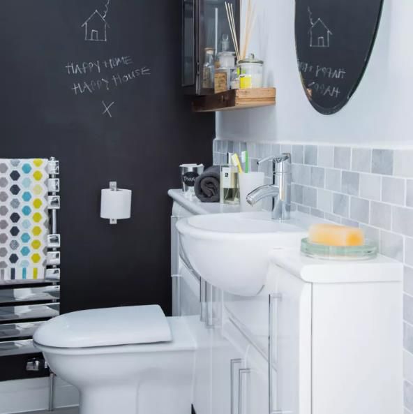 黑板漆讓您可以隨時改變前景。作為樓下廁所的想法,它創造了一個機會,可以為客人寫歡迎信息或在使用房間時思考令人難忘的名言。為如廁訓練增添趣味元素是一個好主意或家庭浴室。