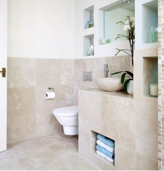 衣帽間的空間幾乎總是有限的,這意味著您需要尋求智能浴室存儲的想法。這些圍繞馬桶建造的櫥柜和架子不僅創造了必要的存儲空間,而且還隱藏了水箱以實現流線型飾面。
