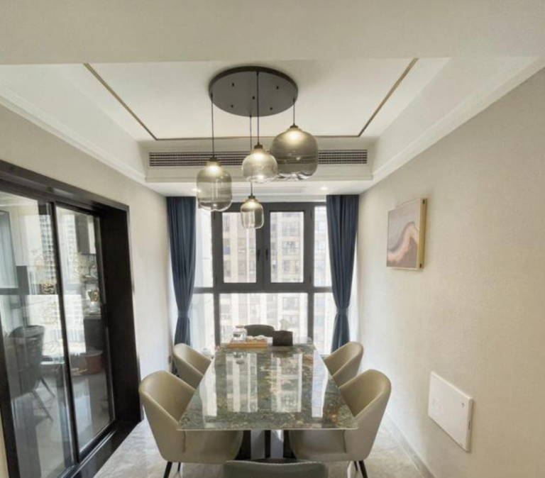 這是餐廳,布置了一張方形巖板餐桌,占用的空間大小位置合適,一家人開開心心坐在一起用餐,真的很幸福了??臻g不大,但是看著這個角度,跟我們常見的樣板房一樣,顏值很高,也很時尚。餐廳大大的落地窗,采光非常充足,光線很好。而且旁邊就是廚房了,煮好的飯菜可以很快端出來,方便用餐!