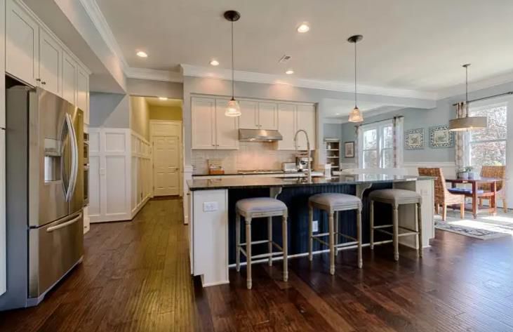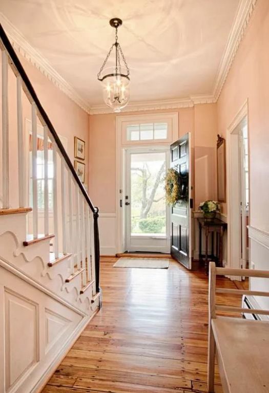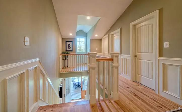 另一個凸起的面板護墻板的例子正在翻新的農舍的樓梯一側使用。這張照片顯示,您可以在農舍中使用正式的凸起面板樣式,以獲得休閑優雅。順便說一句,你不喜歡那個 3 燈吊墜嗎?對于門廳來說,這是一盞很棒的燈