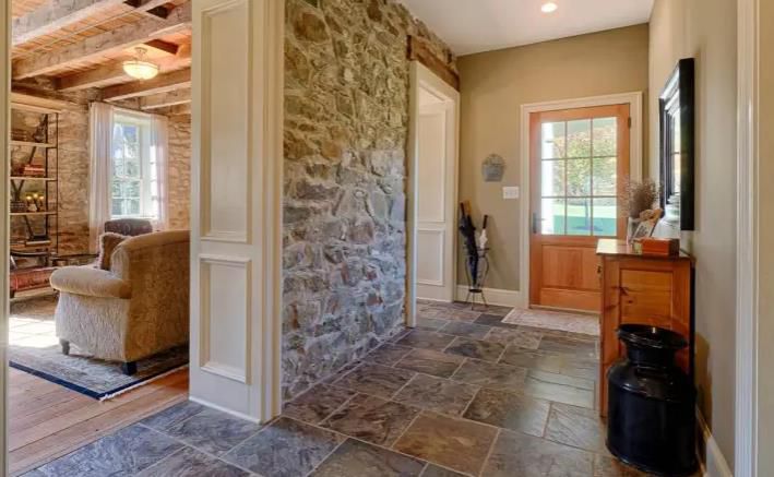 相框造型在門框內部也很漂亮,讓入口通道看起來更正式。我喜歡石墻、外露橫梁、石板地板和木質入口門的造型。