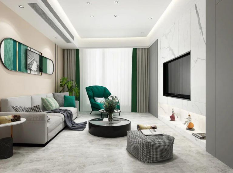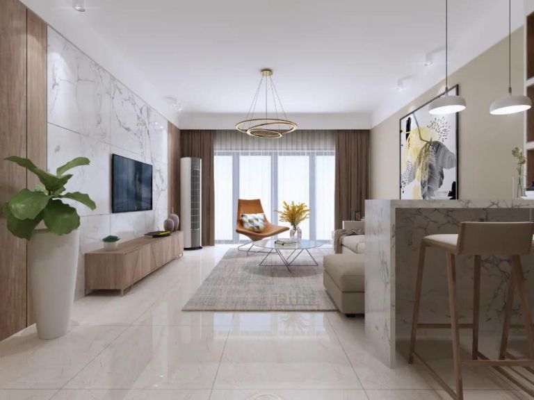 在比較現(xiàn)代風(fēng)的空間中,也可以在電視墻加入大理石的背景墻設(shè)計,同時在兩側(cè)加入對稱的木飾面材質(zhì),也可以增加空間的自然舒適,避免大理石質(zhì)感帶來的單一冰冷感受。
