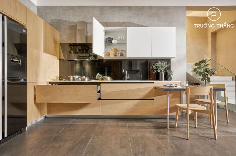 L型的廚房布局可以讓小廚房的感覺從局促變得更寬敞。設(shè)計也總是從美學(xué)角度考慮,讓廚房不僅是一個烹飪空間,而且通過增加玻璃櫥柜或開放式擱板來展示裝飾菜肴或有吸引力的裝飾物品,更加多樣化。這種廚房風(fēng)格非常適合小而方形的空間。