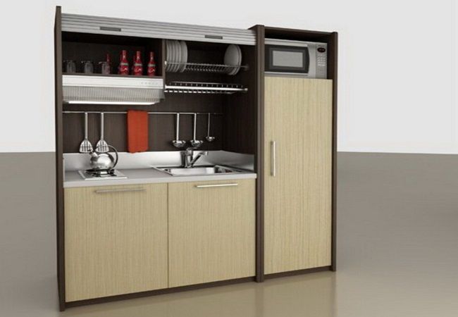 近年來,像這樣的微型櫥柜的廚房設計在需要緊湊且便宜的廚柜的家庭中變得非常流行。這不僅是一個方便的廚柜模型,還為您的廚房空間創造了獨特的新功能。